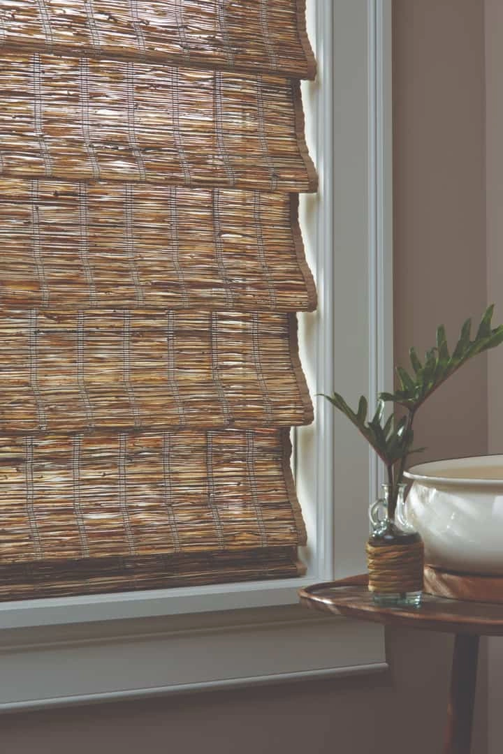Available in the style of Roman shades, waterfall Roman shades, or vertical drapery Provenance® Woven Wood Shades are a soft window treatment made from organic elements including woods, reeds, grasses, and bamboo. Their textured weave adds dimension and visual interest while also filtering light for a beautiful diffuse effect; or, if you prefer room-darkening abilities you can add a liner to woven wood shades for optimal light control and increased privacy. Provenance® Woven Wood Shades come in a variety of colors and work well as the base for layered window treatments when paired with side panels, drapery, or window toppers such as a valance or cornice.